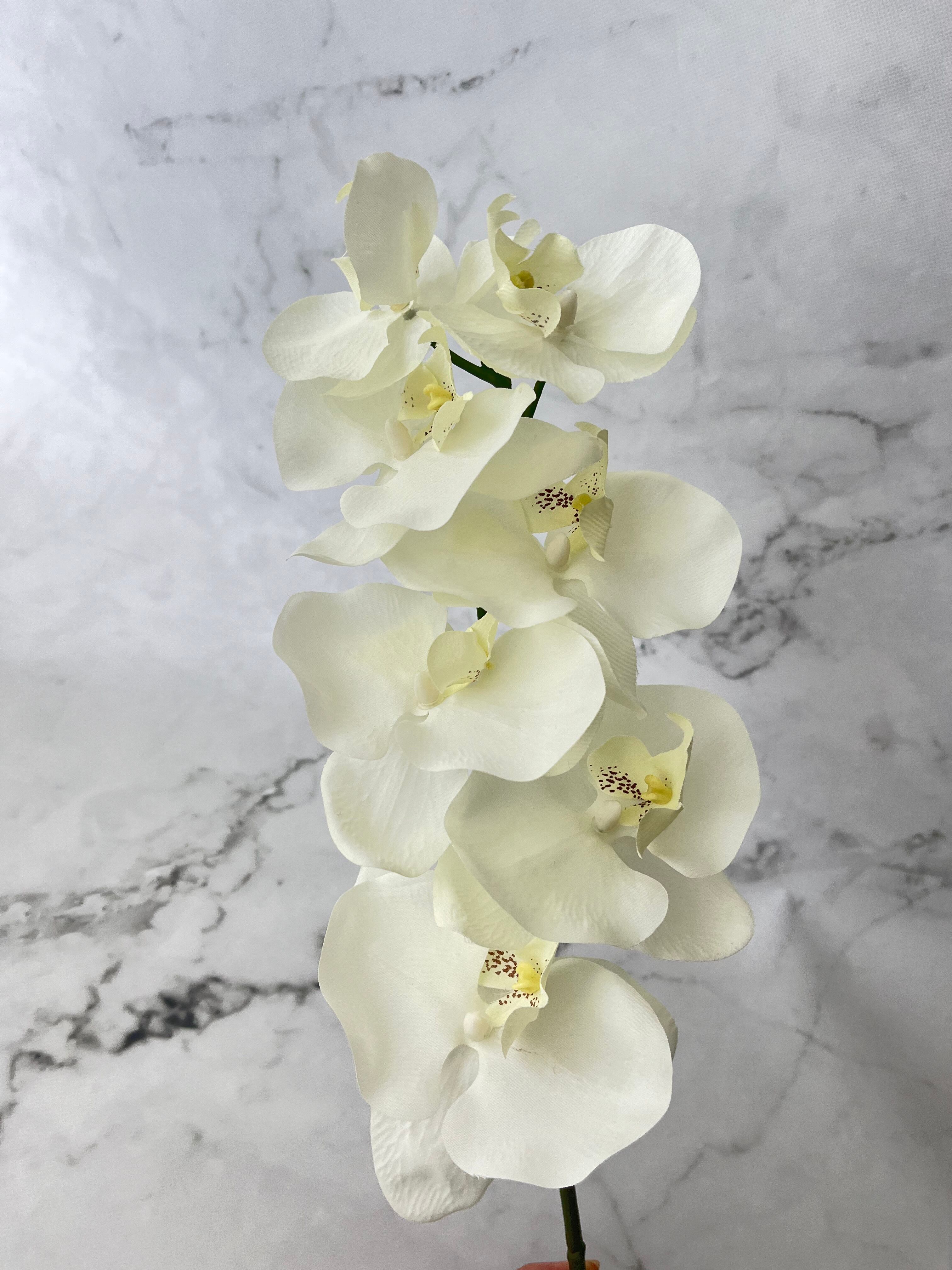 透明なバルーンと高品質な美しいアーティフィシャルフラワーを組み合わせたバルーンフラワーギフトです。数ある胡蝶蘭アーティフィシャルフラワーの中でも質感や色味などにこだわって、自信を持っておすすめできるものをセレクトして使用しています。オフホワイトの布と太めのゴールドサテンリボンを使って、高級感のある仕上がりにしております。